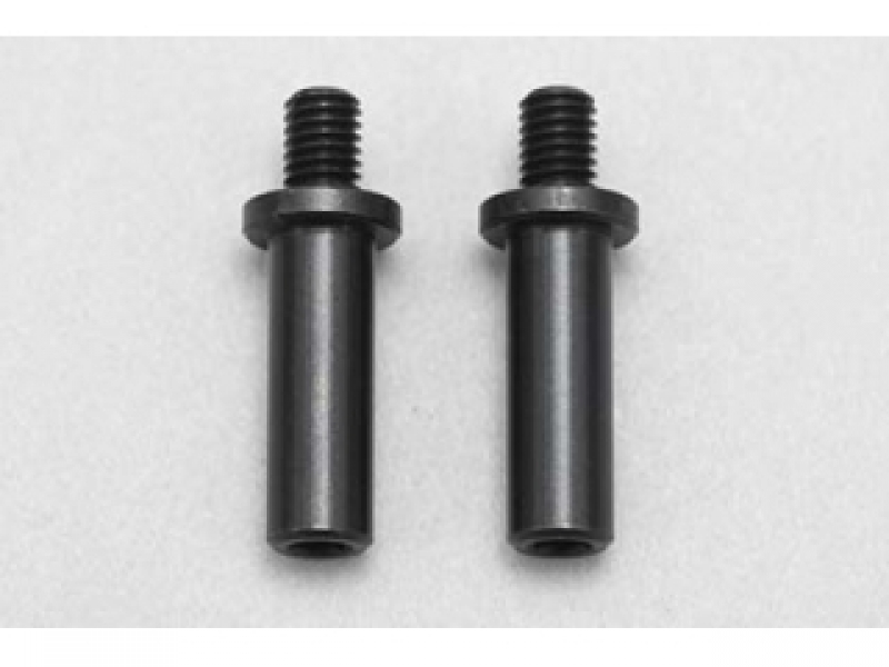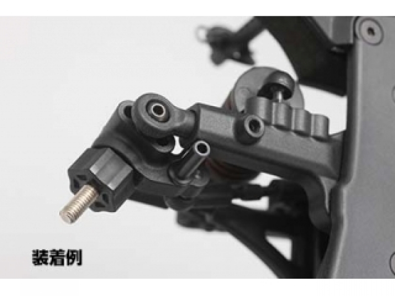 YD-2シリーズのステアリングブロックに取り付け、切れ角を規制するためのストッパーピンです。シャフト径は4mmでスチール製。キット標準のセットスクリューを使用すると、フル舵角でのサス作動時にネジ山で引っ掛かりを感じることがありますが、このパーツに交換することでストロークに影響を与えません。