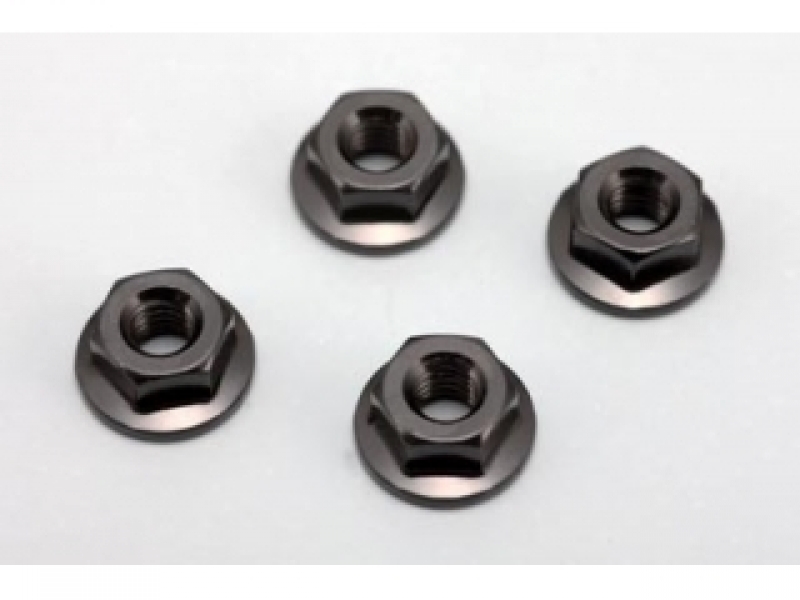 ホイールアクスルなど4mmスクリュー用の軽量なアルミ製ナイロン フランジ ロックナットです。どのようなマシンにも合わせやすいブラックアルマイトで、4個入となっています。