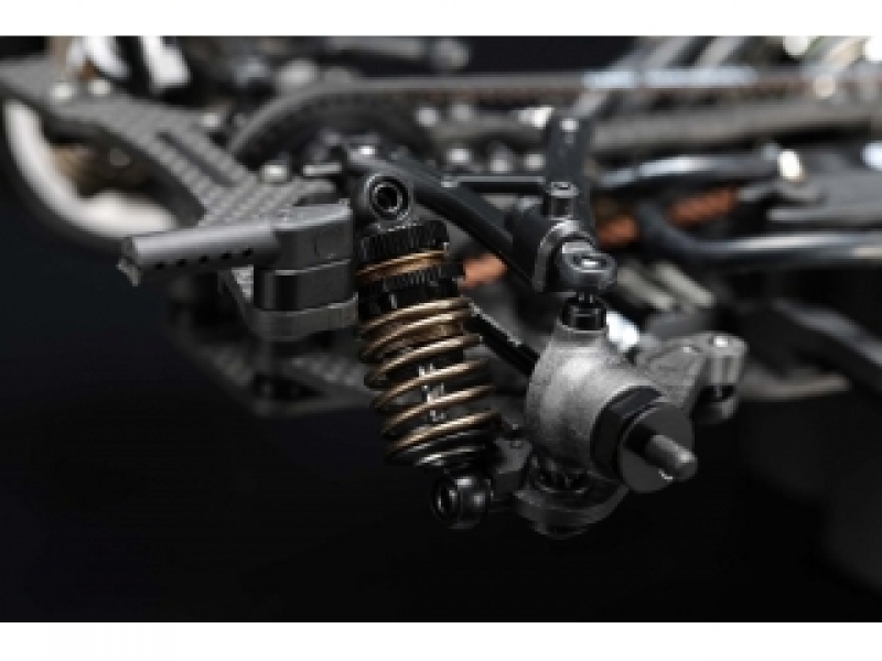 ●新型のグラファイト製前後サスアームは2.4mm厚の素材を使用。従来よりもしなやかな設定で路面追従性が高く、ショックのレバー比変更の効果でサスペンション作動もリニアになっています。