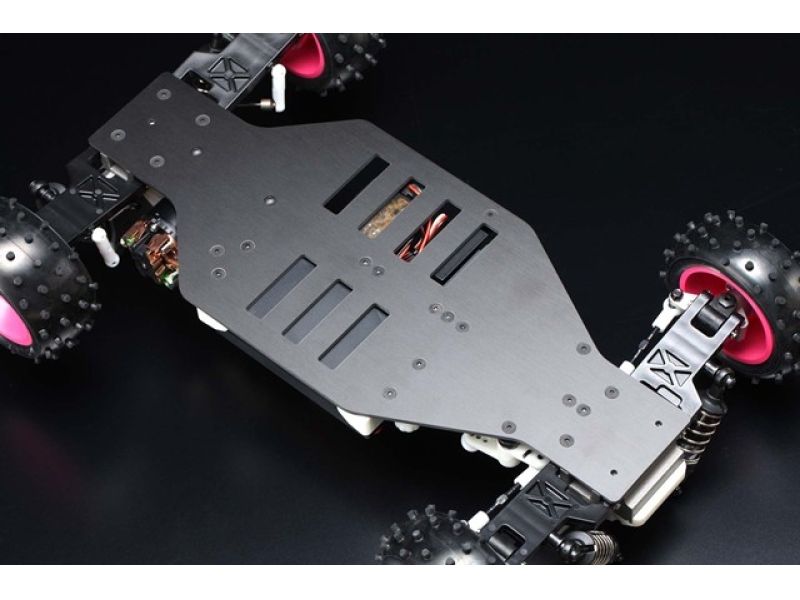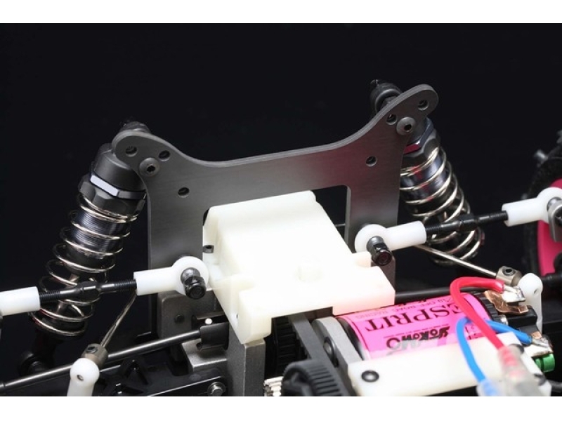 また、このモデルではメインシャーシ、前後ショックタワー、サーボステーなど高剛性のブラックカーボンを採用し、マシン剛性向上により走破性を高めています。ぜひ走行してお楽しみいただきたいマシンです。