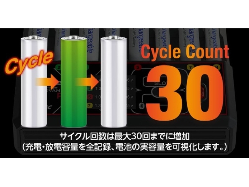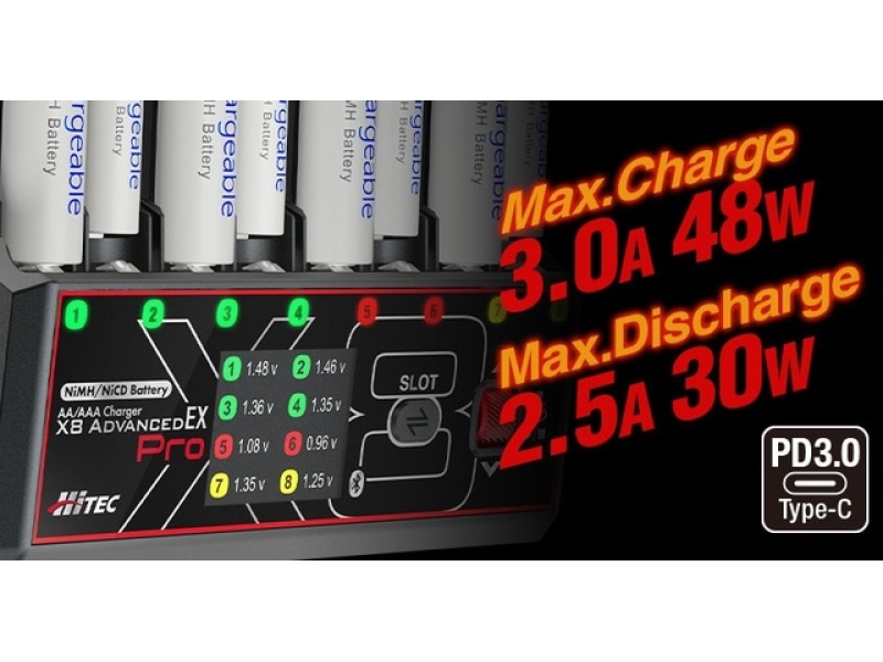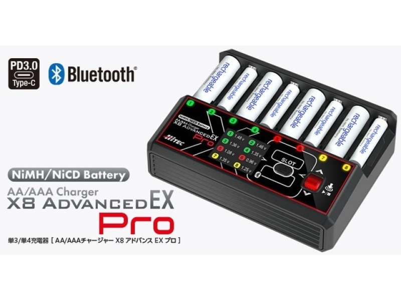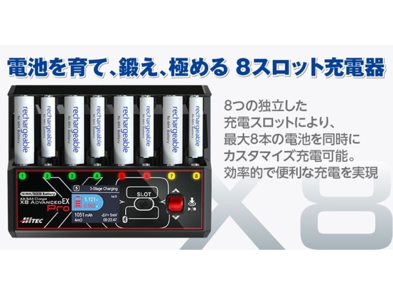 Ni-MH/Ni-Cd電池に対応した高性能スマート充電器「AA/AAA Charger X8 Advanced EX Pro[ AA/AAAチャージャー X8 アドバンス EX プロ ]」本製品は、単3・単4電池を最大8本まで同時に充電でき、各スロットを独立制御することで電池ごとに最適な充電管理を実現します。7種類の充電・放電モードや最大3.00Aの高電流充電、Bluetooth 5.0によるスマートフォンアプリ連携を備え、日常用途から競技・レース用途まで幅広いニーズに対応する製品です。