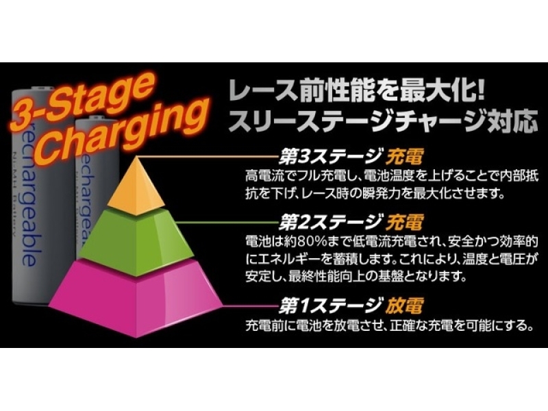 第3ステージ[充電] 高電流でフル充電し、電池温度を上げることで内部抵抗を下げ、レース時の瞬発力を最大化させます。