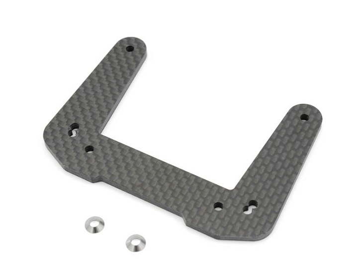 アルティマ用CNC削り出しのフロントダンパーステー。FRPをカーボンでサンドイッチしたハイブリッド材を使用し、適度なしなり具合を得る事でクラッシュ時の耐久性をアップ。