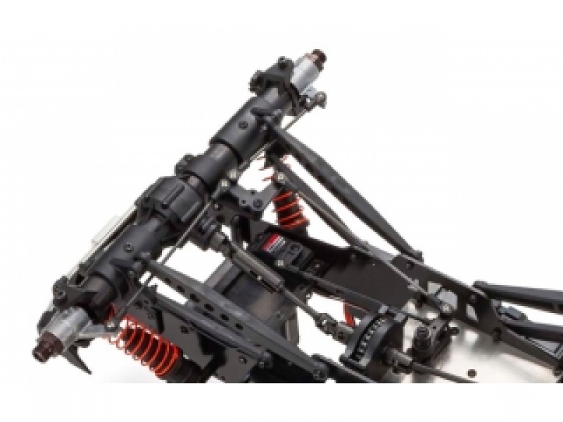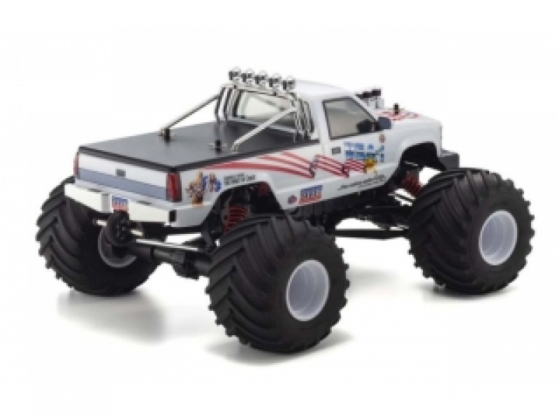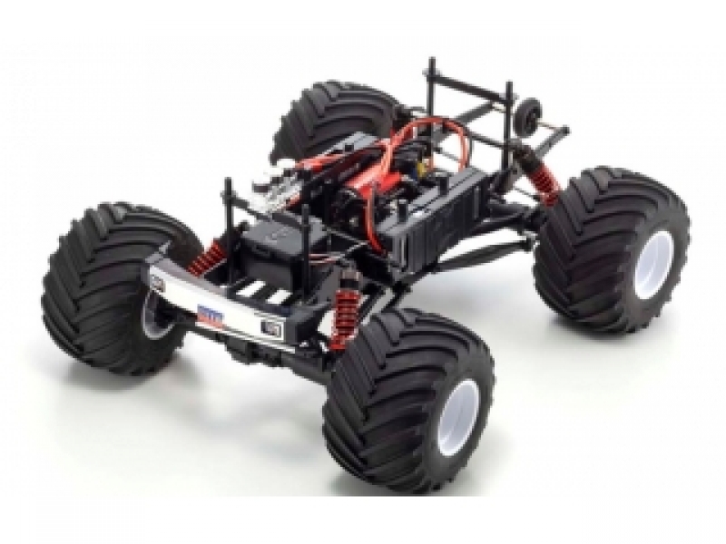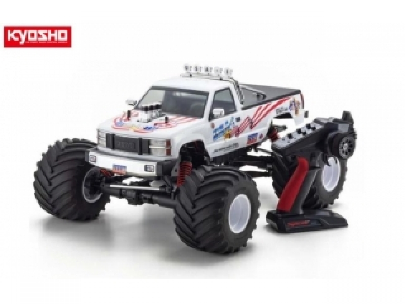 アメリカンモータースポーツの代表ともいうべき存在の一つにモンスタートラックレーシングがあげられます。実用車のピックアップトラックをモチーフにしたボディを、ビッグタイヤ+タフな構成のシャシーに搭載し、スピードやその迫力を競うモンスタートラックイベントは、数えきれないほどのギャラリーを熱狂させてきました。そんなモンスタートラック界の象徴でもあるチーム「USA-1」のマシンが1/8スケールRCカーで登場。京商では1990年代にも1/8スケールのUSA-1をラインアップしていましたが、今回の再販にあたってほぼ全てをリニューアル。「ULTRA SCALE」ボディは完全新設計でディテールアップし、シャシーはマッドクラッシャー&FO-XXと共通の5リンクリジッド式4WDを大幅にリファイン。実車顔負けの迫力ある走りを実現しました。VE(電動)バージョンのUSA-1には、KV2300というハイパワータイプのブラシレスモーターを搭載し、ハイスピード走行を可能にしています。特にスタートダッシュの鋭さはGP(エンジン)バージョンをしのぐほどです。全長570mmというビッグサイズの車体をものともしない高出力ユニットにより、爽快感あふれるドライビングを楽しめます。キットは組み立て完成済みのレディセットでの販売となり、スケール感豊かなボディは、塗装はもちろん、1990年代当時のカラーリングを再現したステッカーも貼り付け済み。別売りとなる走行用バッテリーを充電し、送信機に単3乾電池を装着するだけですぐに走行可能という手軽さも魅力的。スペアパーツも用意されているためメンテナンスの心配はなく、オプションパーツを装着したチューンアップも可能です。