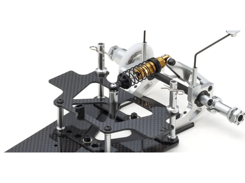 ●剛性の高いカーボン製メインシャシー&アッパープレートに、適度なしなりでタイヤのグリップ力を高めるFRP製リヤAバーを装備