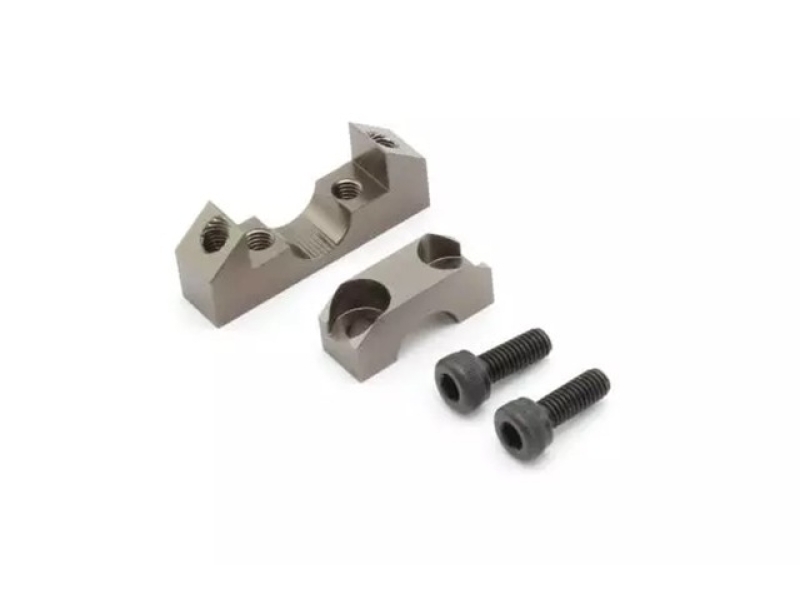アルミ削り出しの高強度、高精度アクスルホルダー。上下2分割でアクスルをしっかりと挟み込む形状なのでキャスター角を細かく変更可能。