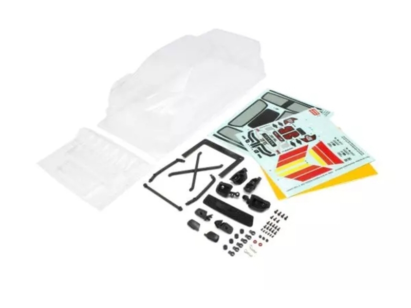 ボディのスケール感をひときわ際立たせるボディアクセサリーパーツ、スポイラー、ロールケージ、デカール、マスキングシートが付属します。