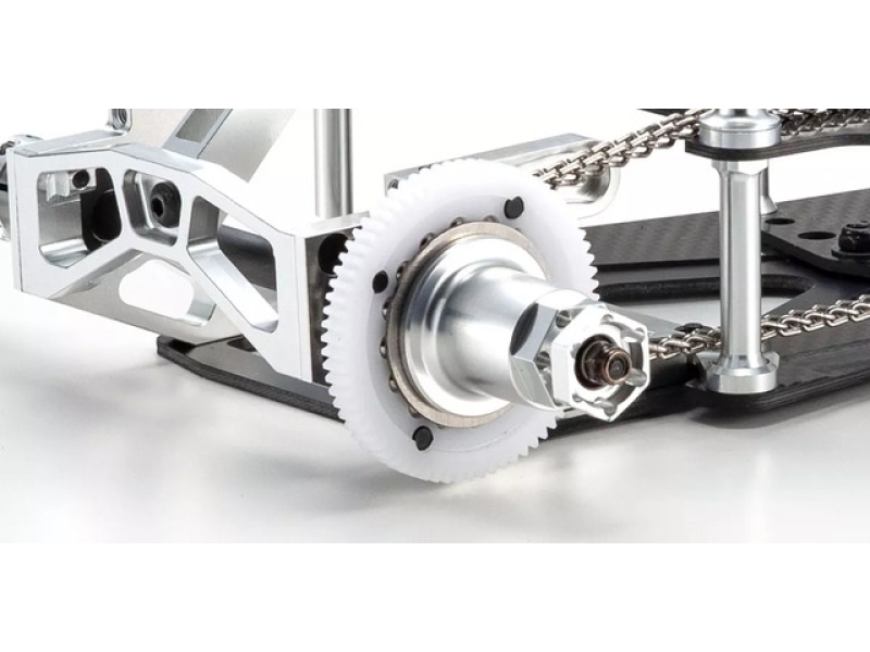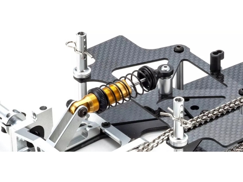 ●剛性の高いカーボン製専用メインシャシー&アッパープレートに、適度なしなりでタイヤのグリップ力を高めるFRP製リアAバーを装備。