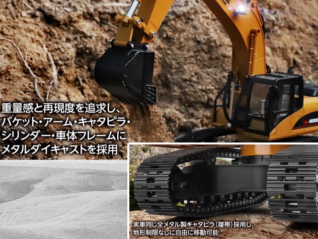 ●重量感と再現度を追求し、バケット・アーム・キャタピラ・シリンダー・車体フレームにメタルダイキャストを採用
