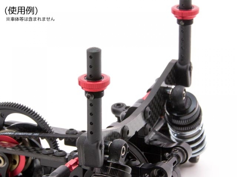 ボディの高さ、取付け前傾角度はセッティングの重要なポイントの一つです。そのボディの高さを細かく、正確に調整することが可能なアルミ製ボディハイトアジャスターです。直径6mmのボディマウントを使用した1/10ツーリングカー、ドリフトカーなど幅広い車種で使用可能です。ブラックとレッドの2種類をラインナップ。