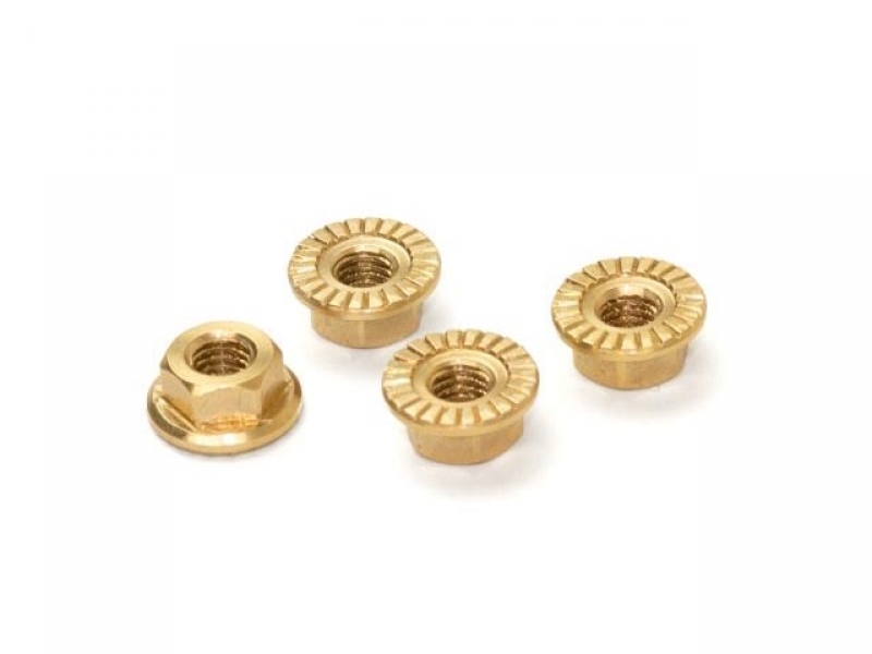 真鍮材から高精度に削り出した、セレート付フランジホイールナット。 1/10スケールツーリングカーの一般的なアルミ製ホイールナットを、この真鍮製ホイールナットに交換することで、高いトラクションが得られます。 切削加工によって作られたセレートがホイールにしっかり食い込み、確実にホイールを固定します。 1個あたりの重量:約1.4グラム