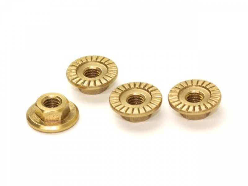 真鍮材から高精度に削り出した、セレート付大径フランジホイールナット。 1/10スケールツーリングカーの一般的なアルミ製ホイールナットを、この真鍮製ホイールナットに交換することで高いトラクションが得られます。 切削加工によって作られたセレートがホイールにしっかり食い込み、更に大径フランジがホイールの取付け剛性を高めます。 1個あたりの重量:約1.8グラム