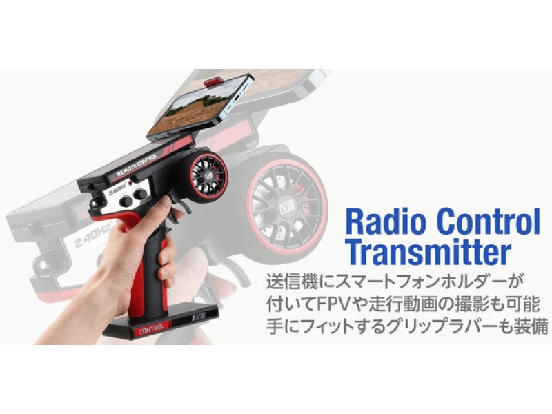 送信機にスマートフォンホルダーが付いてFPVや走行動画の撮影も可能。手にフィットするグリップラバーも装備