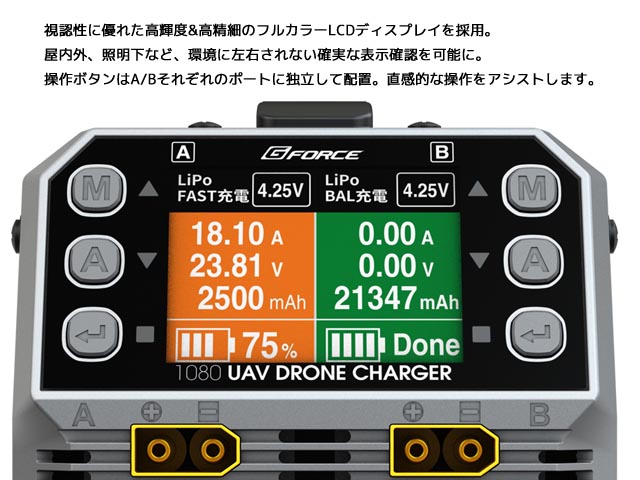 ○視認性に優れた高輝度&高精細のフルカラーLCDディスプレイを採用。屋内外、照明下など、環境に左右されない確実な表示確認を可能に。操作ボタンはA/Bそれぞれのポートに独立して配置。直感的な操作をアシストします。