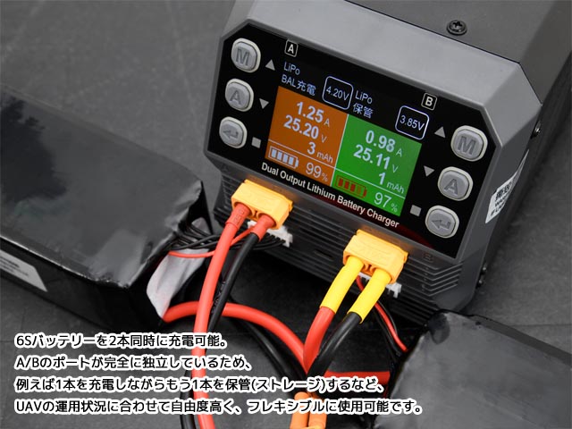 ○6Sバッテリーを2本同時に充電可能。A/Bのポートが完全に独立しているため、例えば1本を充電しながらもう1本を保管(ストレージ)するなど、UAVの運用状況に合わせて自由度高く、フレキシブルに使用可能です。