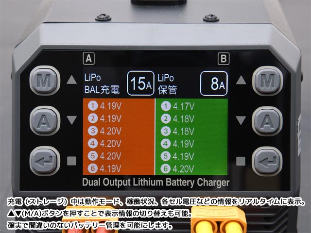 充電(ストレージ)中は動作モード、稼働状況、各セル電圧などの情報をリアルタイムに表示。▲▼(M/A)ボタンを押すことで表示情報の切り替えも可能。確実で間違いのないバッテリー管理を可能にします。