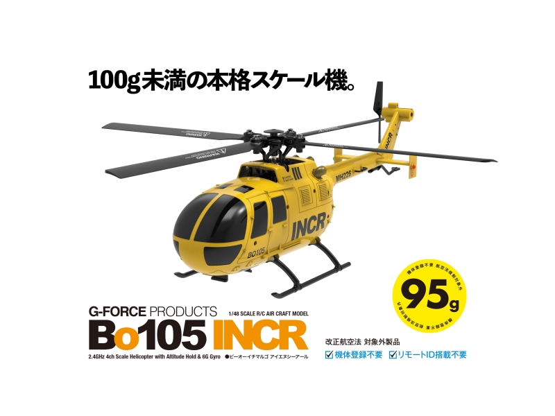 100g未満の実機ライクな本格スケール機。メッサーシュミット・ベルコウ・ブローム(MBB)社が開発した小型の双発多用途ヘリコプター・Bo105を1/48スケールでRCモデル化しました。実機を髣髴とさせる4枚ローターブレード仕様。ボディはインジェクション成形により精密にディテールを再現しています。