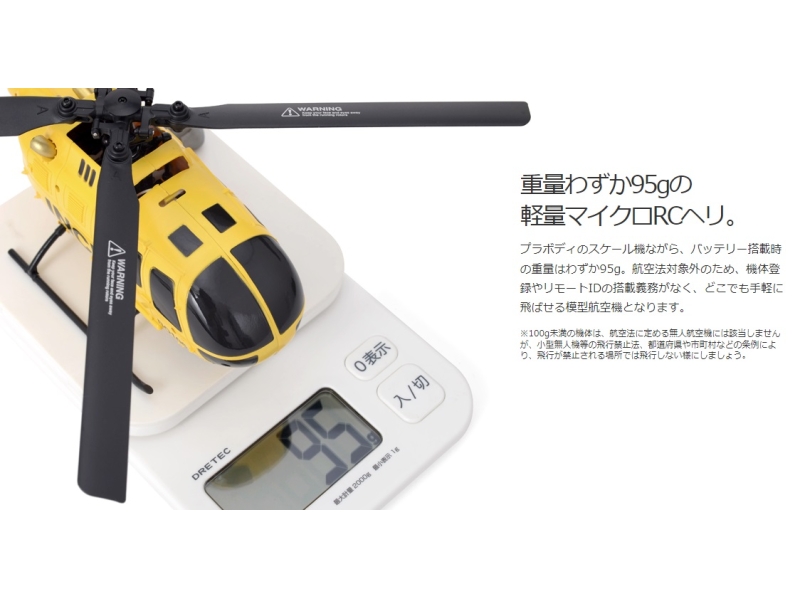 機体重量は100g未満。ですので改正航空法の対象外。機体登録、リモートIDの搭載は不要です。