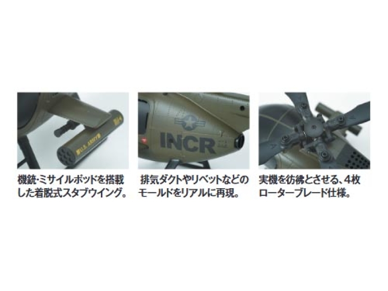 アメリカのMDヘリコプターズが製造する、軽量多目的ヘリコプター・MD500をミリタリー仕様として1/48スケールでRCモデル化しました。実機を髣髴とさせる4枚ローターブレード仕様。ボディはインジェクション成形により精密にディテールを再現しています。