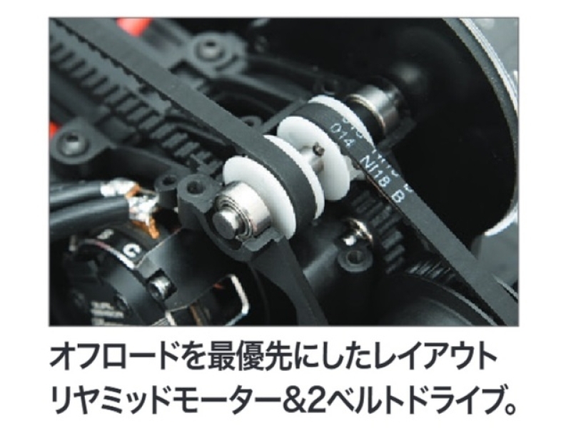 かつての常勝マシンを彷彿とさせる2ベルトドライブ4WDシャーシ。
