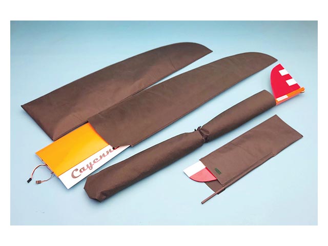 主翼2分割、水平尾翼もビス1本で取り外せます。MAX約300gまで搭載できるバラストルーム標準装備(バラストは別売り)。標準で機体カバーが付き、キャリングBOXに入っているので、遠征にぴったり。車に積むのに気を使わずにすむのはもちろん、電車など公共交通機関で遠くへ行ってみるのはどうでしょう?