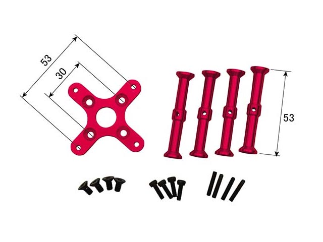スパイダーマウントと4本のアルミポストマウント、そしてモーター取付ビス、スパイダーマウント取付用キャップスクリュー、マウントを胴枠に取り付ける3mm両ネジボルトが入っています。