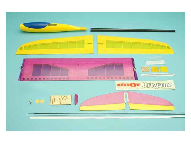 フィルム貼り済み完成機「オレガノII」は1.4mクラスのモーターグライダーです。前部胴体ポッドはグラス製ゲルコート仕上げ、後部胴体ブームはテーパーカーボンパイプ製とすることで、機体全体の剛性が向上し、それぞれの舵がリニアに反応します。また、エルロン形状、翼形、主翼平面形、上半角などを細かくチューンアップし、その滑空性能と運動性には定評があります。機首は38mmスピンナーのアポロモーターがぴったり合う設計になっています。