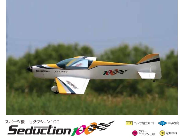 スポーツ機プラスαのデザインコンセプトで誕生し、世界中の話題となったセダクションシリーズ。翼長100cm、2サイクル15クラスのエンジンとブラシレスモーターによる軽快な飛行を目標としたスポーツ機が「セダクション100」です。
