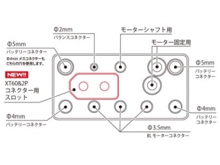 Φ4mm、5mmバッテリーコネクターの他にもΦ3.5mmブラシレスモーター用コネクターやΦ2mmバランスコネクターも固定可能です。