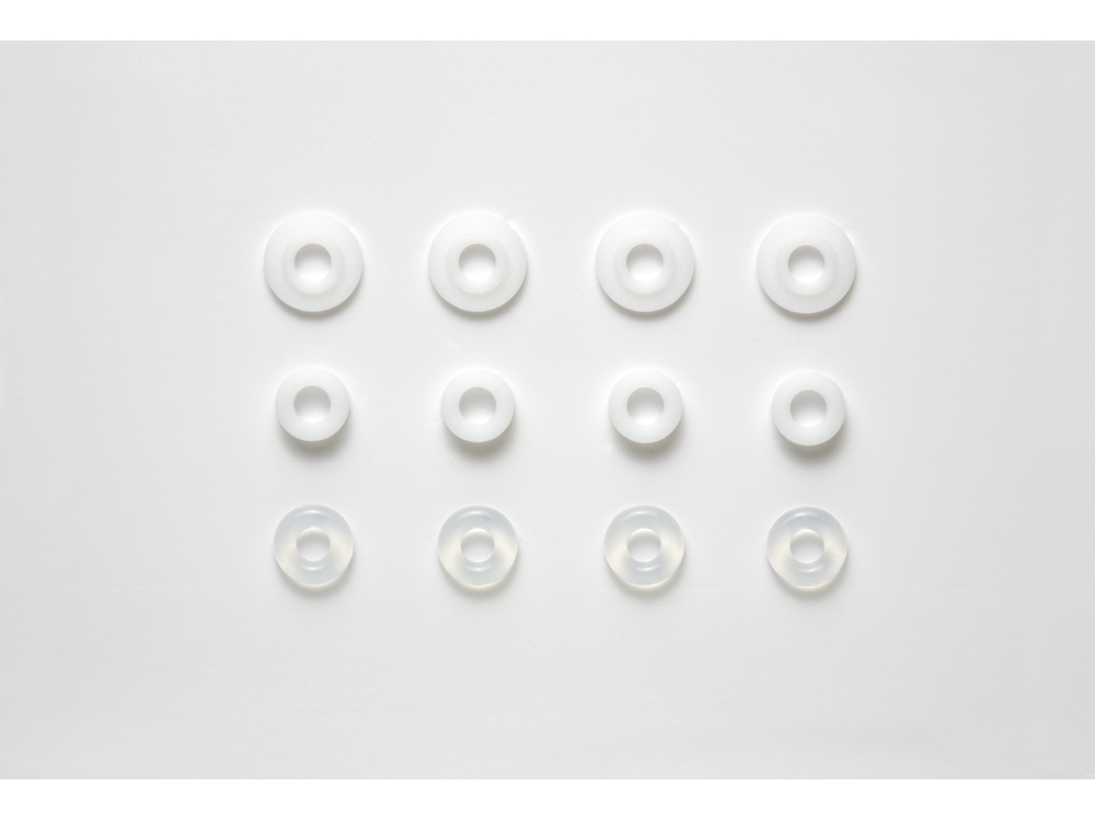 TRFダンパー用のフッソ樹脂削り出し製ロッドガイドとスペーサー、摩擦抵抗の少ないシリコン製Oリングのセットです。ピストンロッドの動きをスムーズにします。