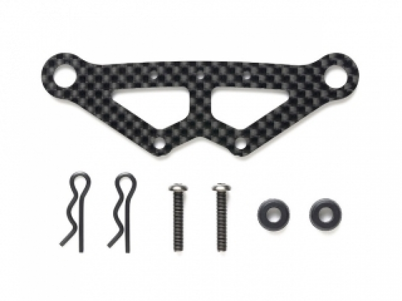 軽量・高剛性なカーボンプレートにより、フロントバンパーとボディマウントを確実に押さえ、ボディのバタつきを軽減します。また、カーボンパターンがレーシングムードを盛り上げます。