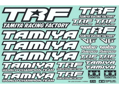 TRFやタミヤをはじめ、VG、VOLAC、TRANSPEEDなどのロゴを用意。黒枠つきのホワイト文字はどんなカラーリングのマシンにもフィットします。