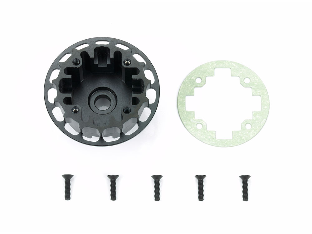 標準装備の樹脂製パーツに換えて使用する高精度なアルミ製ギヤデフプーリーケース。走行中に負荷が加わっても変形しにくく、内部ギヤが差動した時に発生するシリコンオイルの発熱を放熱することで安定した作動を実現します。また、ガスケットの密着性を高め、オイル漏れも最小限に抑えます。