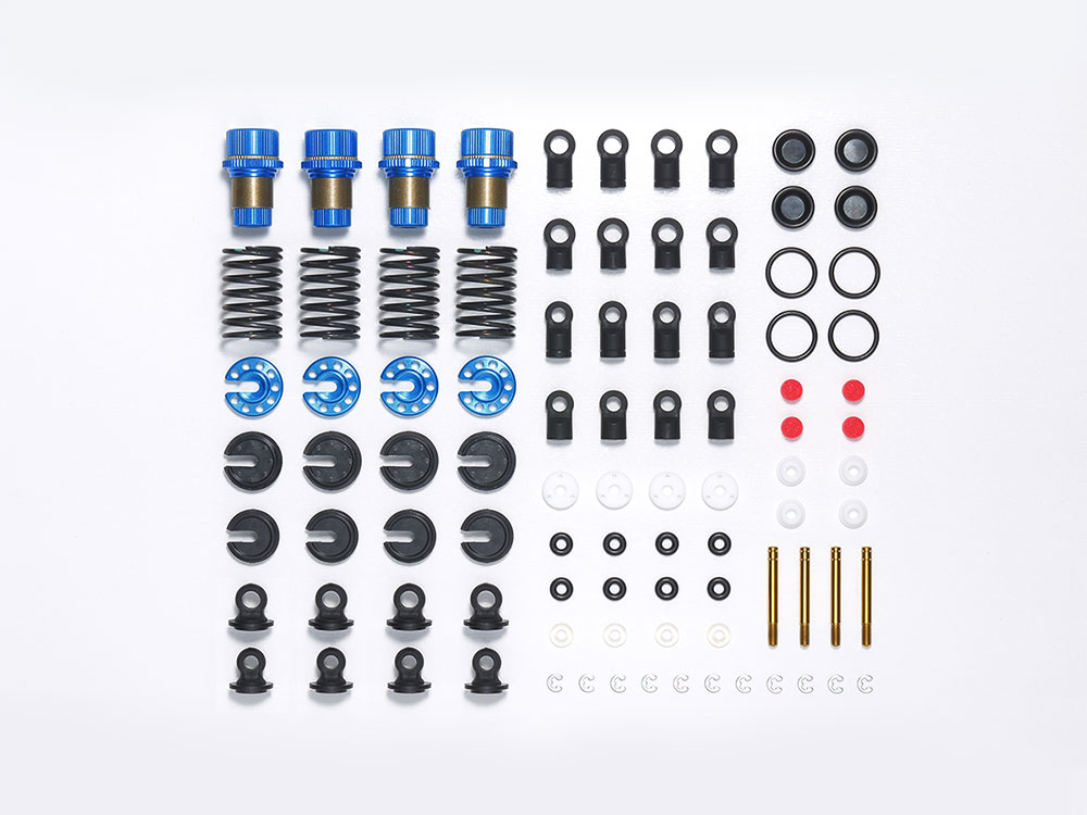 シリンダー、スプリング、ダンパーシャフト、ピストンなど各4本ずつセット。アルミパーツはブルーアルマイト加工。