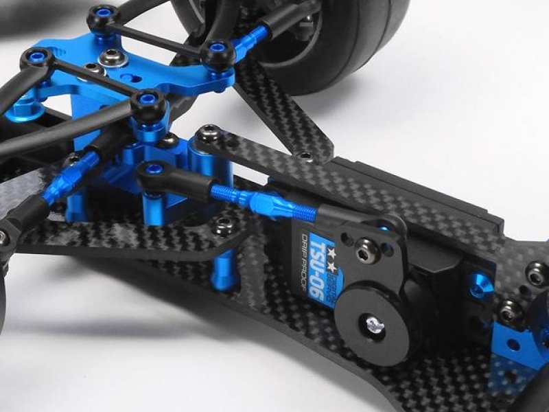 ★ハイエンドレース用のF1シャーシです。★2.5mm厚カーボンロワデッキの中央にLFバッテリー(Mサイズ)を搭載し、フロントサスアームはロワが2.5mm厚カーボン、アッパーが樹脂製で、キャンバー調整可能。★リヤサスはモーターマウントの前後にピロボールを装備してロール中心とし、ピッチングはFRPプレートとTRFダンパーで制御。※使用プロポ:ESC、ロープロファイルサーボ付き2chプロポセット