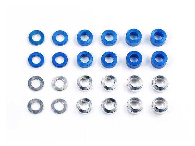 TRF414のサスアームブロックの調整をはじめ様々なセッティングに使える内径3mm外径5.5mmのスペーサーです。0.5mm刻みで3mmまで6種類の厚さをセットしました。