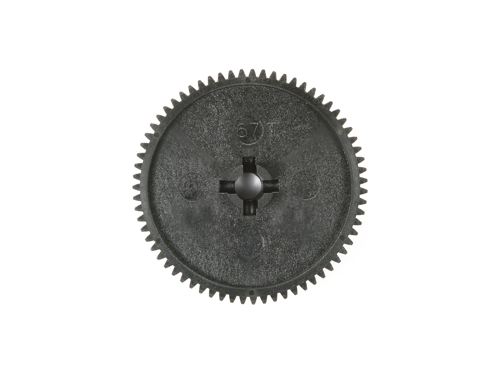 キット標準の70Tに比べ、ハイスピード仕様としたスパーギヤ。キット標準の19Tピニオンを使った場合、標準の9.58から9.17にギヤ比を高めることが可能。さらに別売の22Tピニオンを使えば7.92にすることもでき、コースにあわせたギヤ比のセッティング幅が広がります。