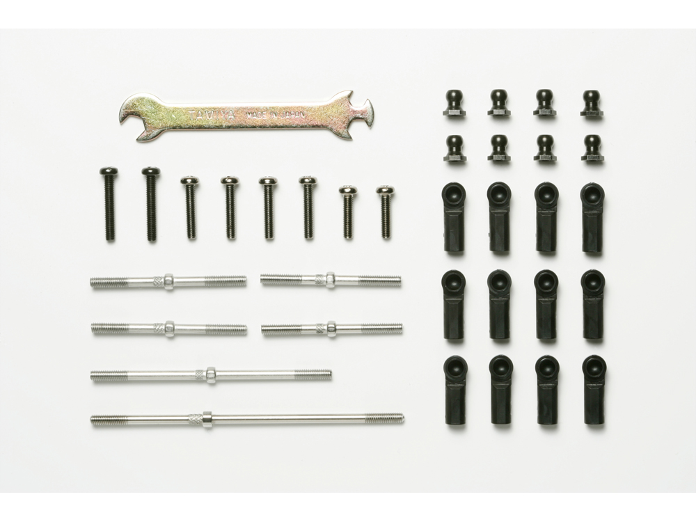 DT-02シャーシの前後アッパーアームとステアリングタイロッド用ターンバックルシャフトです。アジャスターをはずすことなく、付属の板レンチを使って長さが手軽に調整でき、キャンバー角やトーインセッティングが可能になります。