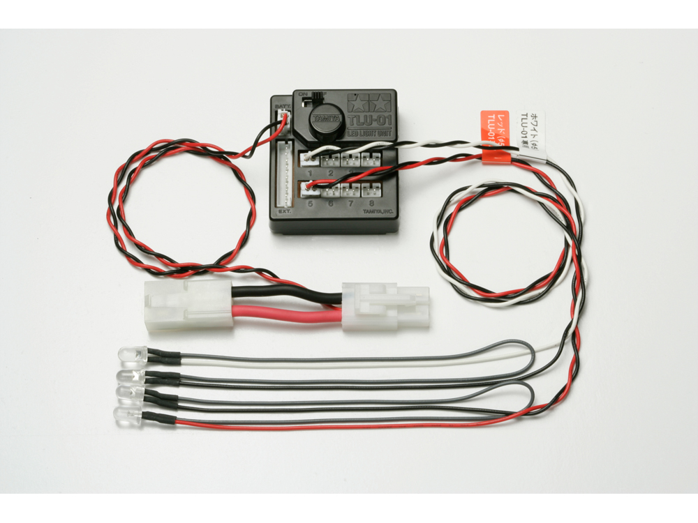 タミヤLEDライトコントロールユニット(TLU-02)Item No:53937 :LEDライトユニット(TLU-01)に接続されたLEDライトの点灯を制御する様々なパターンで設定可能な機能拡張パーツ。送信機の操作に連動したブレーキライト、バックライト、ウインカーの点灯、ハザード点滅、送信機の操作で制御可能なパッシングなど多彩な点灯が可能。