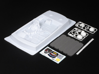 ツーリングカーボディの内部にマジックテープで固定するコクピットパーツです。バイザーなしのヘルメットとバイザー付のヘルメットの2種類のパーツを用意。さらに、ボディ幅に合わせるためのウレタンバンパーやステッカーも付いています。