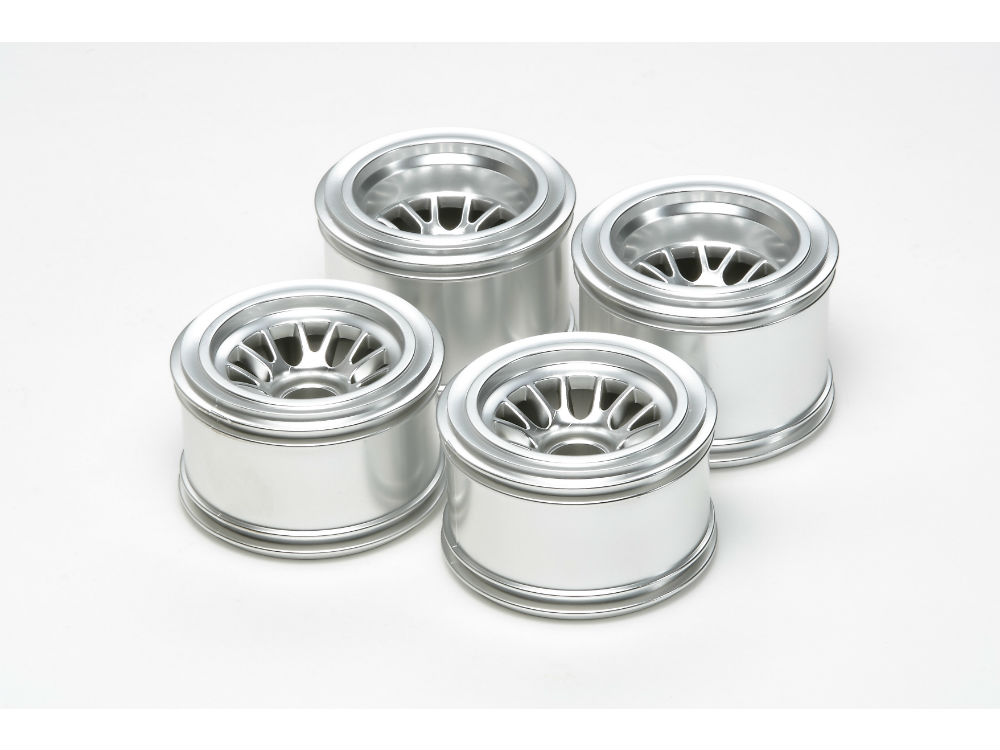 繊細なメッシュデザインにスケール感のあるつや消しメッキを施したラバータイヤ用ホイール。マシンの足もとを引き締めます。ホイール1台分をセット。