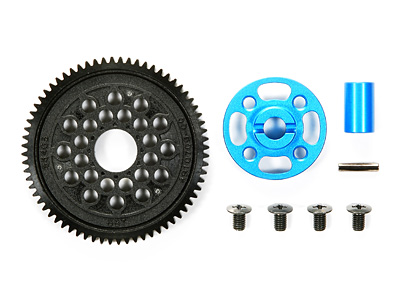 標準装備の70Tスパーのギヤ比(11.38~7.28)から、9.82~6.55に変更してハイスピード化するためのスパーギヤセット。タミヤグランプリに最適です。