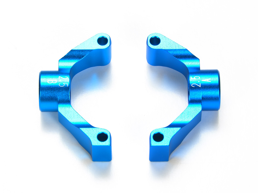 標準装備の樹脂部品A11に換えて使用するリヤアップライト。高精度・高剛性なアルミ切削製、しかもトー角を標準の0度から2.5度に変更。リヤの滑り出しをおさえて、安定したコーナリングを実現します。鮮やかなブルーアルマイト仕様。