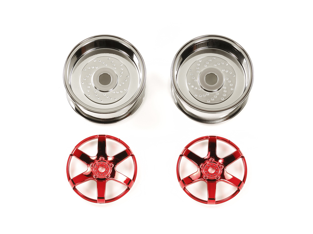 1/10ツーリングカーに幅広く使える2ピースホイールです。スポーク部分は鮮やかなレッドメッキ、リム部分はクロームメッキ仕様。足まわりのドレスアップ効果も抜群です。