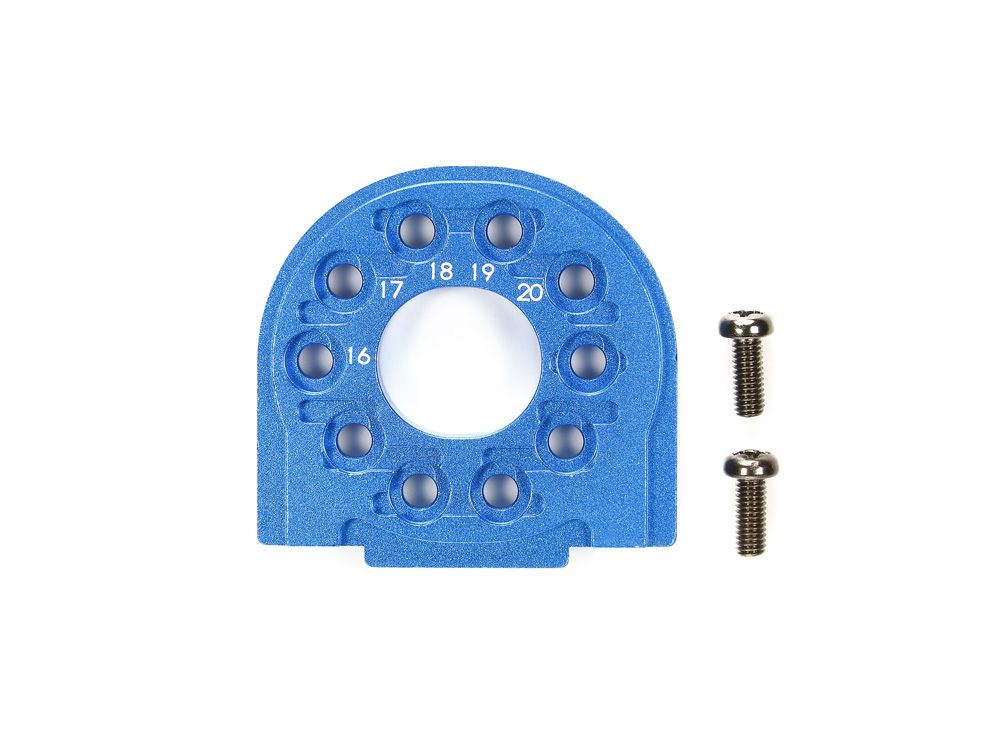 キット標準の樹脂製モーターマウント(D9部品)に換えて使用する、精度・強度ともに優れたアルミ切削製。モーターの取り付け剛性を高めて駆動ロスを減らすだけでなく、放熱効果もアップします。表裏を使用して10種類のギヤ比が選択可能。
