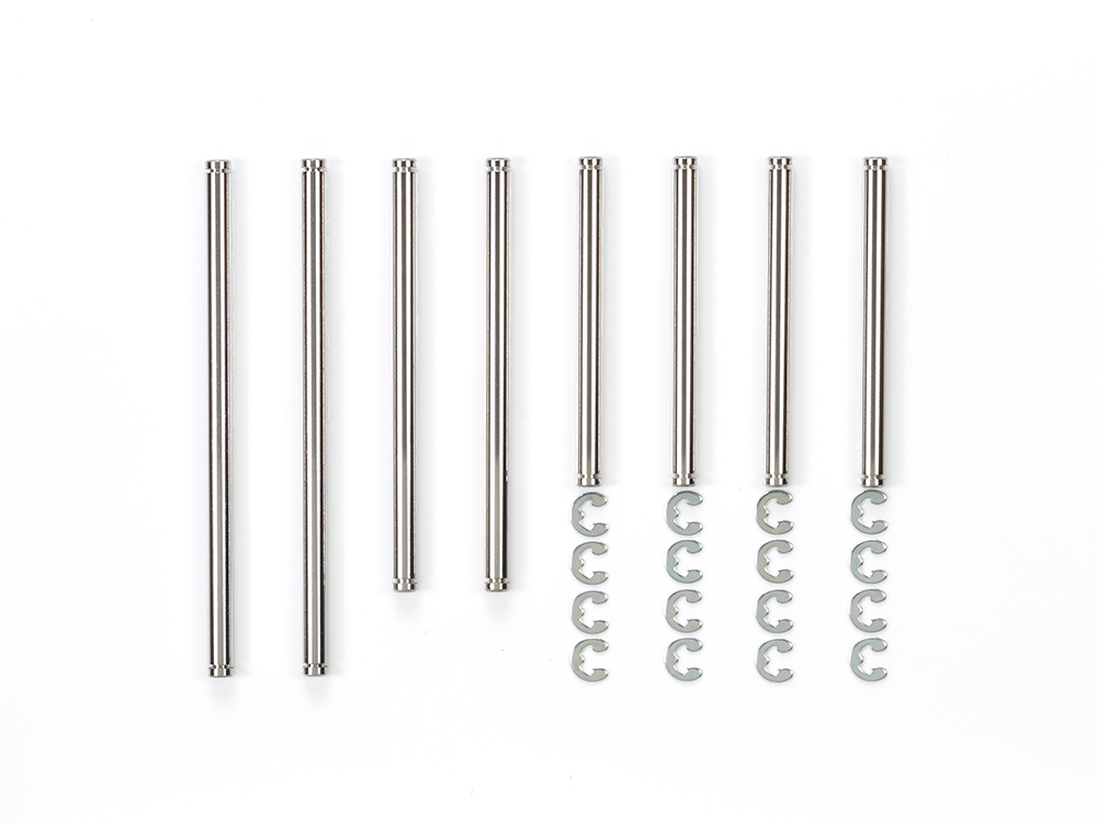標準装備のスクリューピンに比べて精度・強度ともに高いステンレスを採用したサスシャフト。スムーズな動きを長期間保つことができ、また、両端をEリングで固定して脱落を防止します。