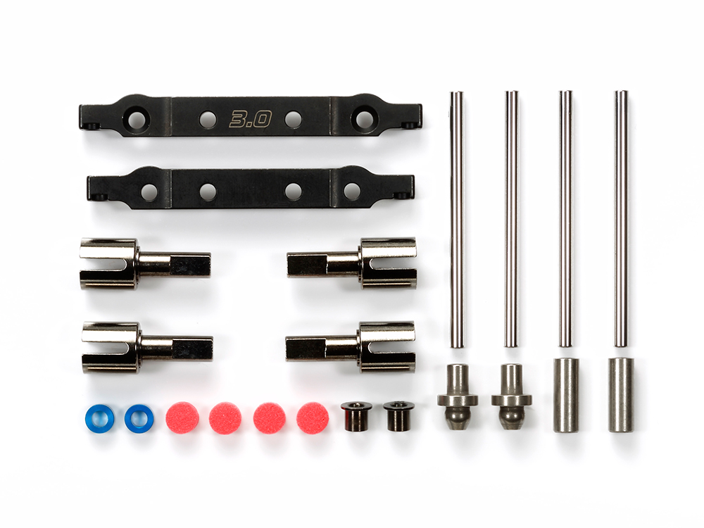 標準のサスプレートに換えて使用するスチール製のサスマウントです。サスアームの取り付け剛性を高め、リヤはトーインを3度に設定して走行安定性をアップ。別売のリバウンドストッパーも装着できます。