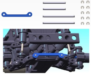 キット標準のスクリューピンに換えて使用する高精度・高硬度のステンレス製サスシャフト。ガタを減らして滑らかな作動を生み出し、さらに両端をEリングで留めるため緩みによる脱落の心配がありません。また、アルミ製サポートブリッジはシャーシ側のサスシャフト先端を左右で連結。万一のクラッシュなどからサスシャフトが広がるのを防ぎ、サスアーム基部の破損を抑えます。*前後に使用する場合は2セット必要です。