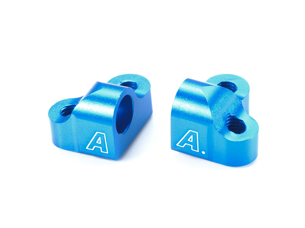 TRF419Xのワイドサスペンションに合わせて、ロールセンターを0.5mm下げたサスマウントです。2本のビスと1箇所のボスによる3点留めとしたL型形状により取り付け時のズレを軽減し、高強度も実現しました。主にフロントに使用します。