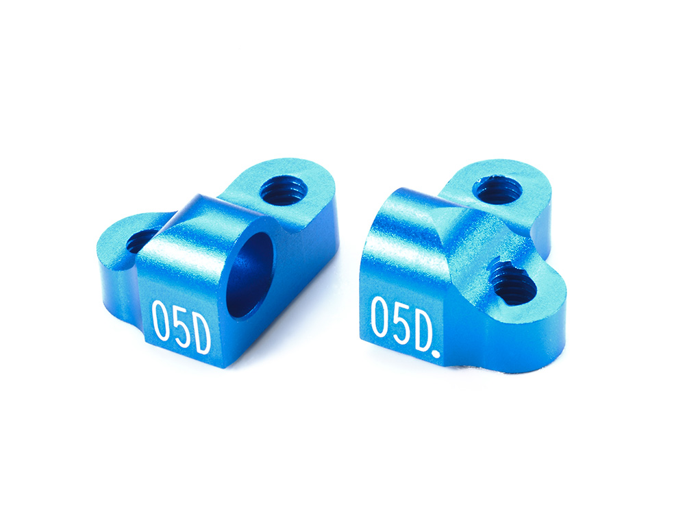 TRF419Xのワイドサスペンションに合わせて、ロールセンターを0.5mm下げたサスマウントです。2本のビスと1箇所のボスによる3点留めとしたL型形状により取り付け時のズレを軽減し、高強度も実現しました。主にフロントに使用します。